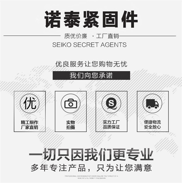 邯鄲市諾泰緊固件制造有限公司座落在中國緊固件制造基地--河北省邯鄲市永年區(qū),地處京廣線107國道、京珠高速公路和永河公路交匯處,地理位置優(yōu)越,交通十分便利。公司本著"以質(zhì)量求生存,以質(zhì)量求發(fā)展,向質(zhì)量要效益"的宗旨,以良好的品質(zhì)、貼心的服務(wù)和合理 的價格竭誠為廣大客戶提供服務(wù)。